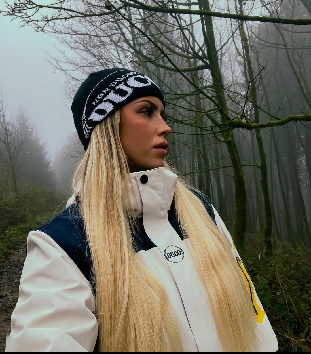 Stay warm and stylish with the Duco Graphic Beanie, a bold and versatile accessory perfect for colder days. Crafted from soft, durable knit material, this black beanie features a standout white graphic design. The centrepiece is the iconic "DUCO" text that is positioned on a slight slant. This beanie combines comfort and fashion, making it ideal for streetwear enthusiasts or anyone looking to add a statement piece to their wardrobe. Its snug fit ensures warmth, while the eye-catching design elevates any casual outfit.