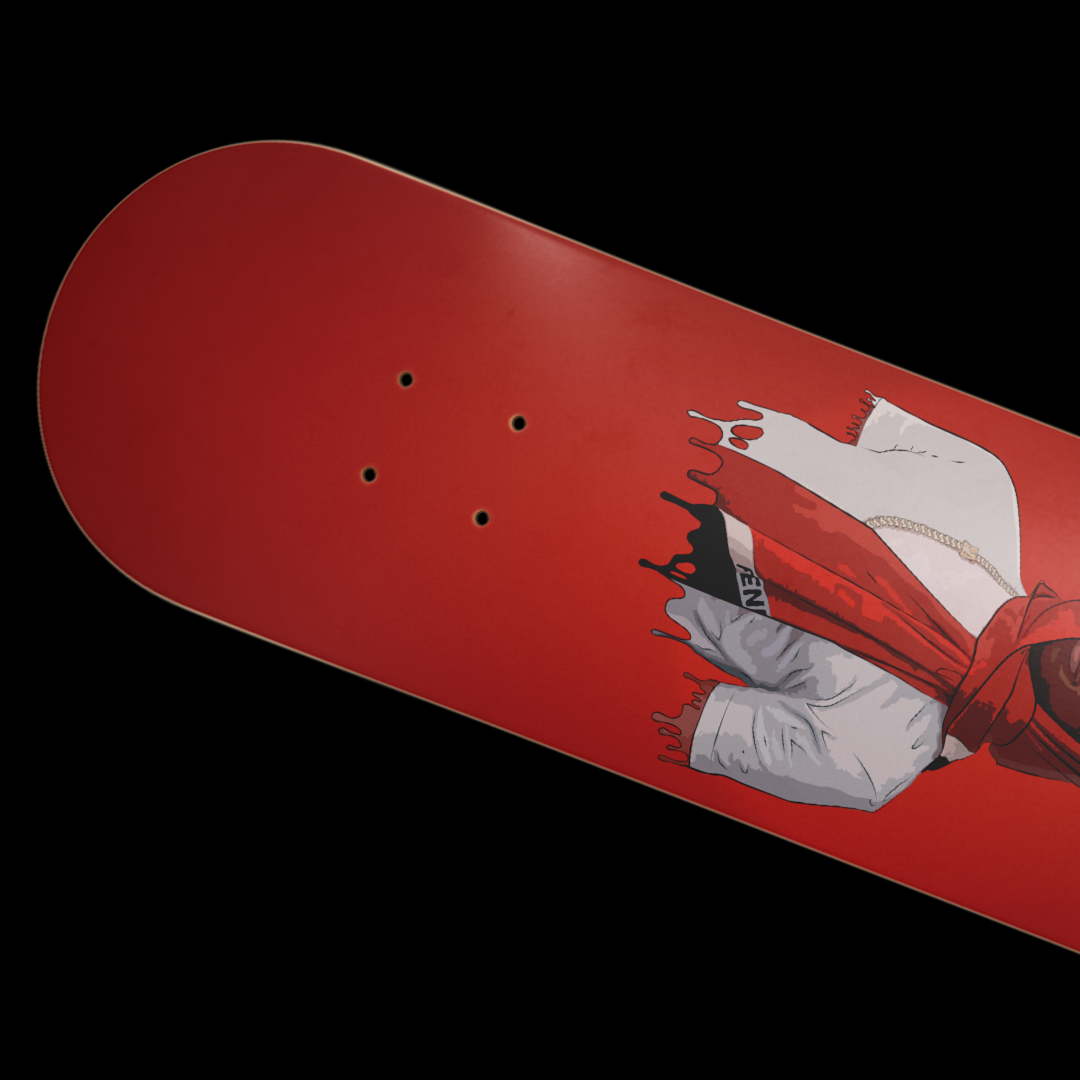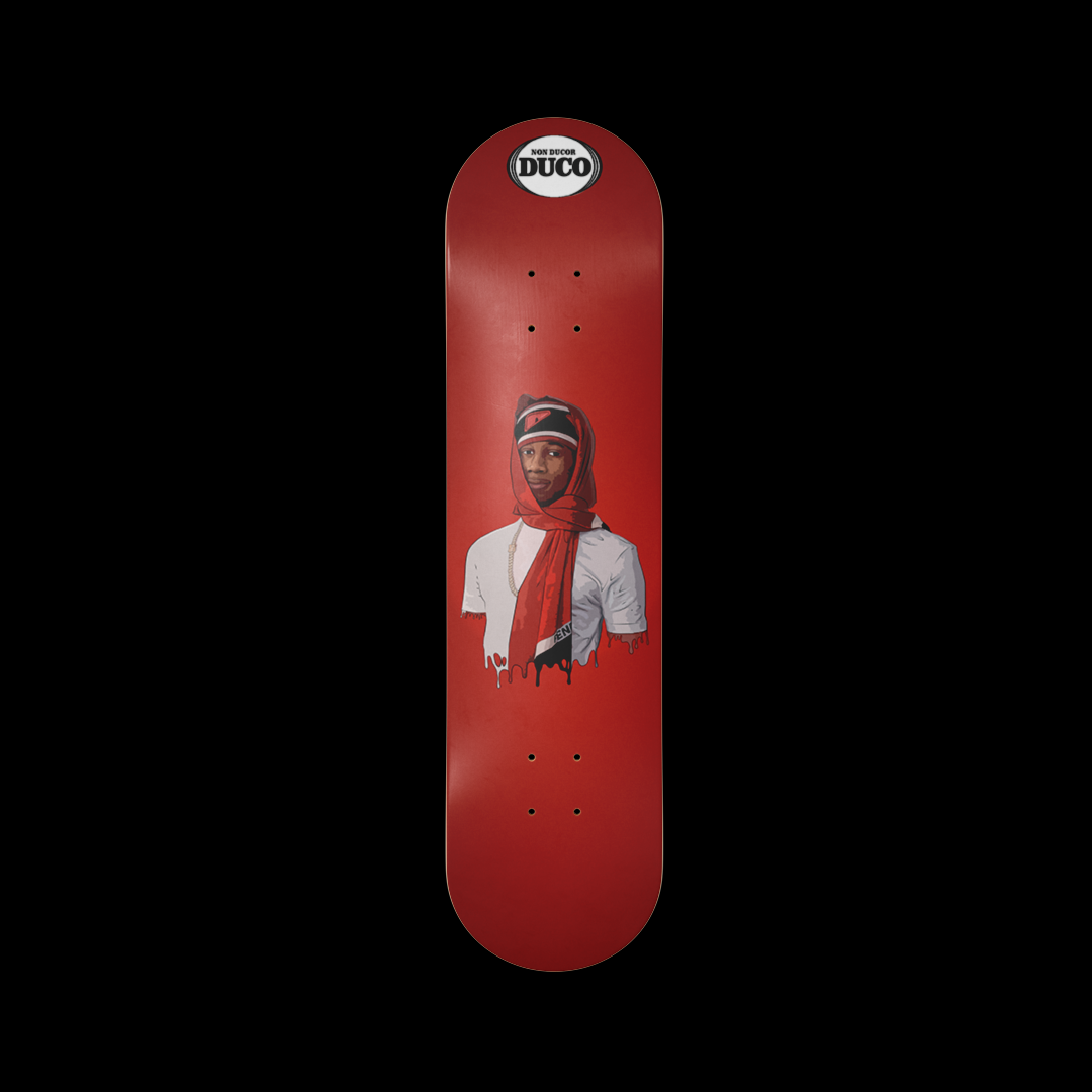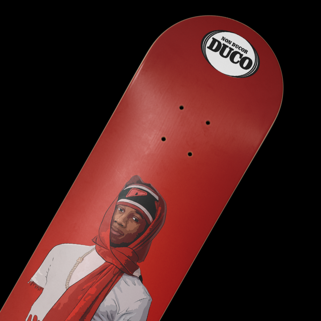 This is a exceptional hand drawn piece of work of the artist "Digga D" which is featured on a red background. This skateboard design is part of the rapper/music section of our designs. All these designs are original and exceptional pieces of art.