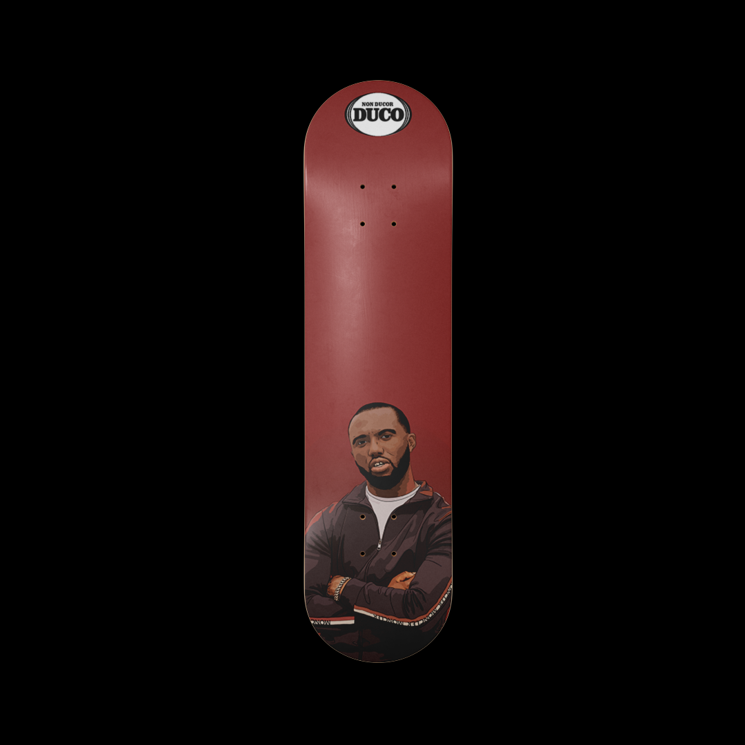 This is a exceptional hand drawn piece of work of the artist "Headie One" which is featured on a dark red background. This skateboard design is part of the rapper/music section of our designs. All these designs are original and exceptional pieces of art.