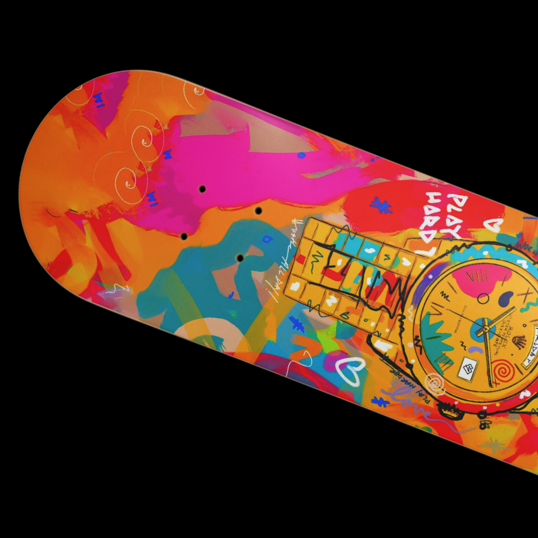 One of the newest and most exciting boards, the orange unique design is executing and aesthetically beautiful. Hours have been spent on this board making it perfect, this board truly stands out. The design is primarily orange featuring a Rolex covered in spray paint.